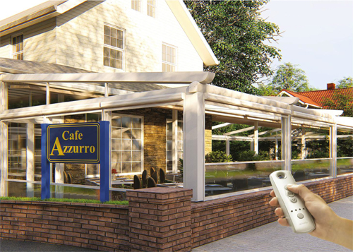 Vertically sliding motorized sashes with tow or three panels from floor to ceiling offers great visibility and convenience. While the panels are retracted down, the system act as a glass railing.By push of a button the panels retract open all the way to ceiling insulation your space with suitable glazed and tampered glass.